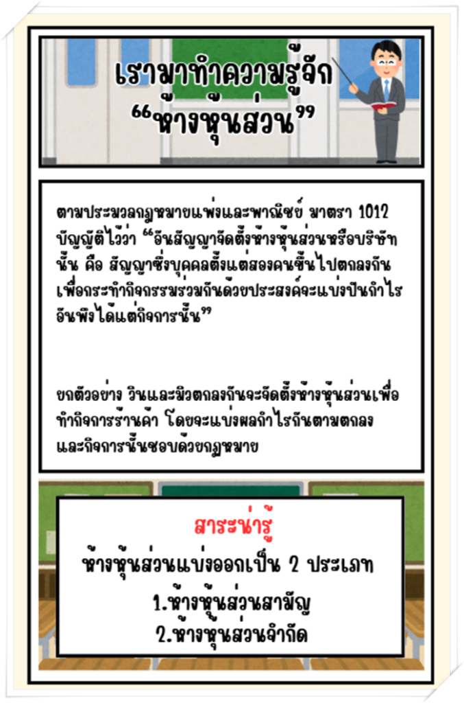 สื่อการสอนประเภทหนังสือการ์ตูนส่งเสริมความรู้วิชาการบัญชีห้างหุ้นส่วน เรื่อง เพื่อนซี้สู่หุ้นส่วน
